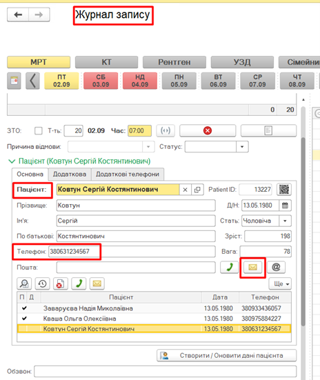 Вибрати пацієнта в журналі запису з телефоном для відправки СМС. Потім натиснути кнопку СМС.