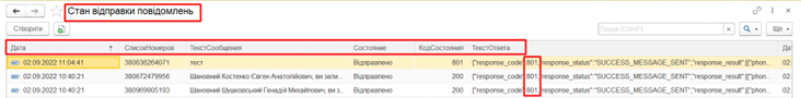 Код 801 – свідчить про те що СМС було відправлено без помилок.