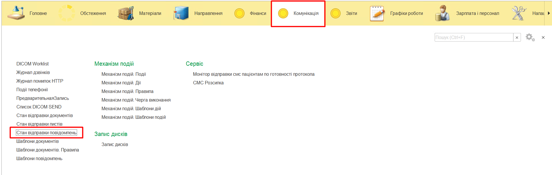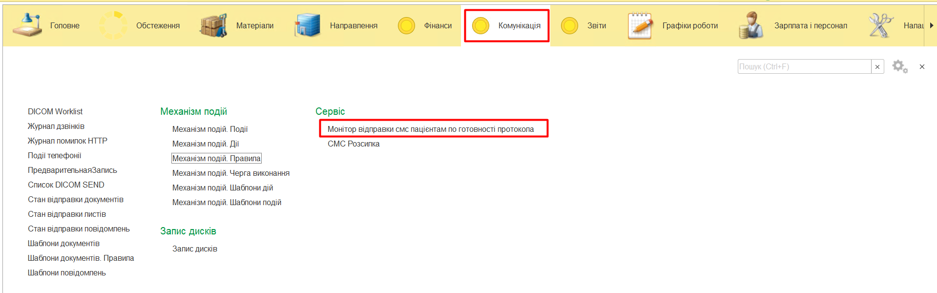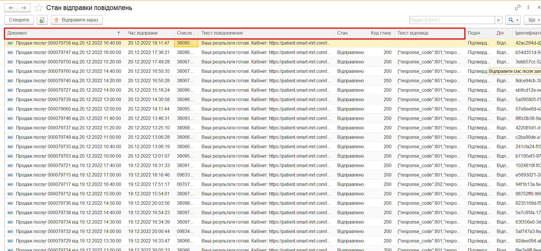 МІС дозволяє відправляти SMS автоматично за допомогою Правил. Для контролю відправки повідомлень можливо переглянути за допомоги таблиці, яка знаходиться в меню «Комунікація» - «Стан відправки повідомлень».