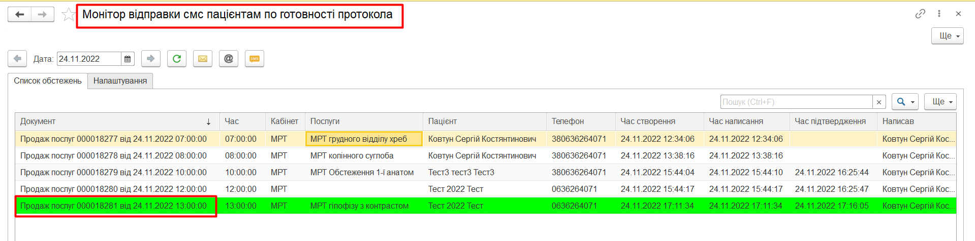 На вкладці Налаштування можливо налаштувати колір надісланих СМС, але Налаштування будуть зберігатись, до виходу співробітника з МІС.