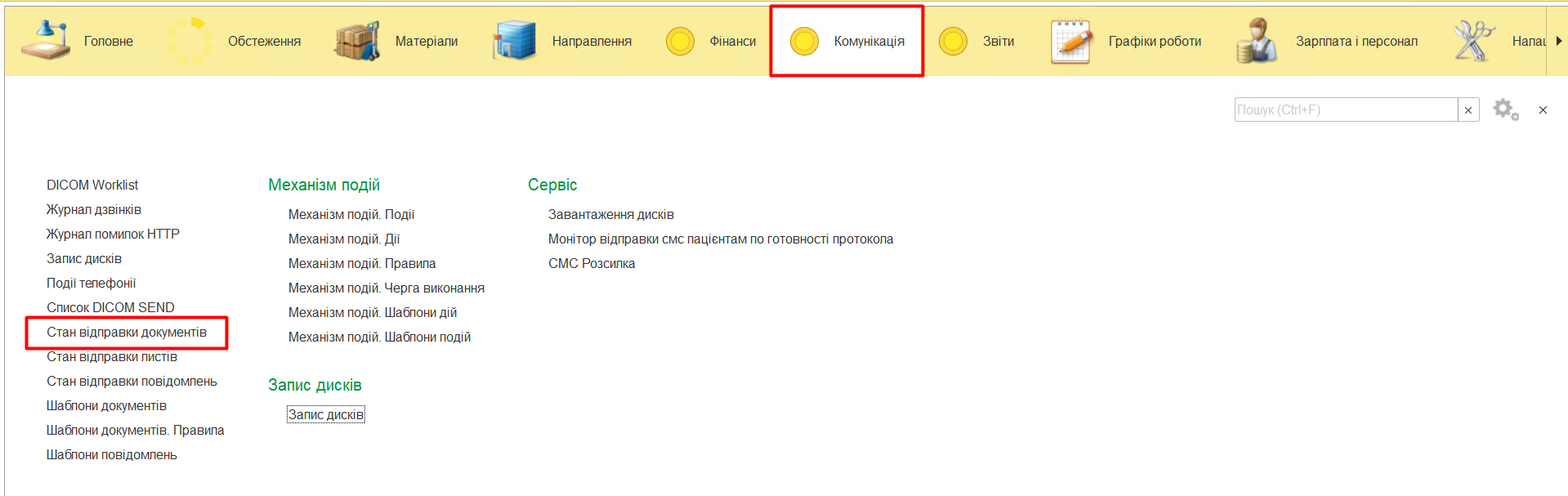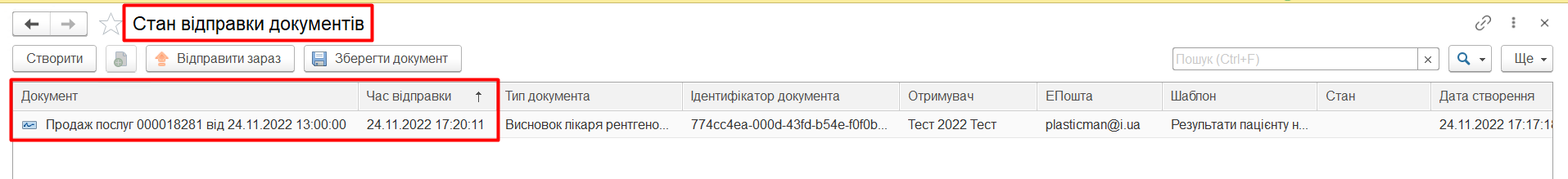 МІС дозволяє відправляти документи (висновки лікаря) автоматично на електрону пошту. Для контролю відправки документів можливо переглянути стан надсиланням на поштові скриньки в режимі online за допомогою таблиці, яка знаходиться в меню «Комунікація» - «Стан відправки документів».