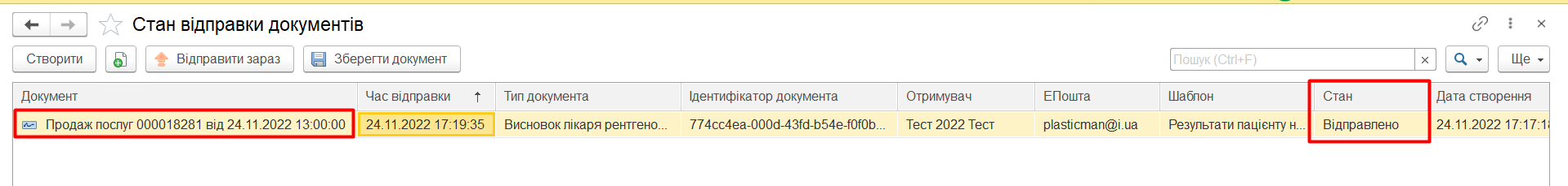 Після того, як МІС надішле документ, стан зміниться на Відправлено