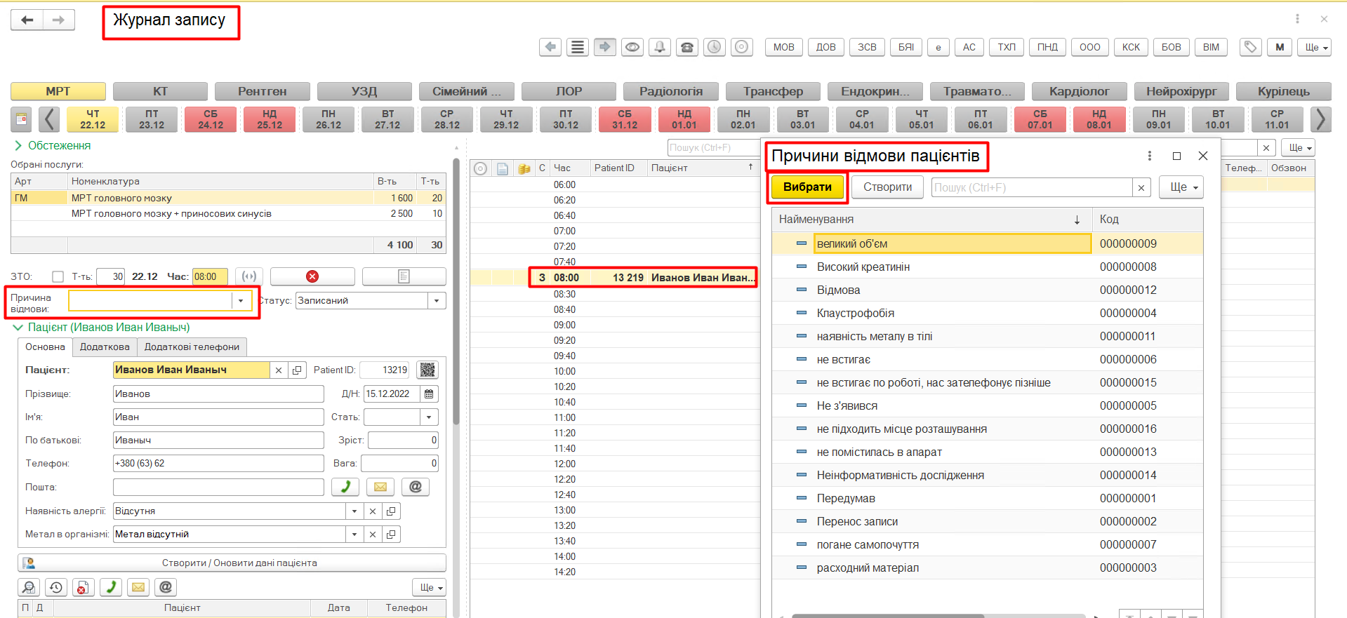 Довідник «Причини відмови пацієнтів» слугує для створення всіх можливих причин відмови пацієнта від обстеження (передумав, ціна, протипоказання), які в подальшому можна аналізувати за допомогою звіту «Відмови пацієнтів».
