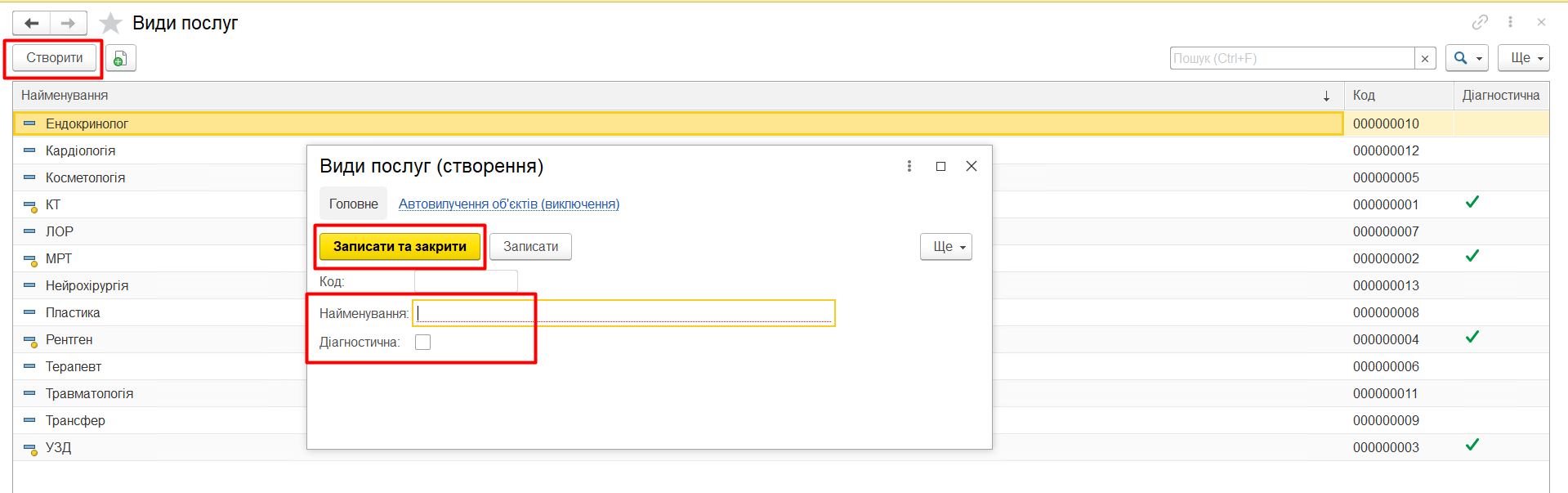 Для створення нового Виду послуги необхідно натиснути кнопку «Створити» та заповнити реквізити довідника у новому вікні, після чого натиснути кнопку «Записати та закрити».