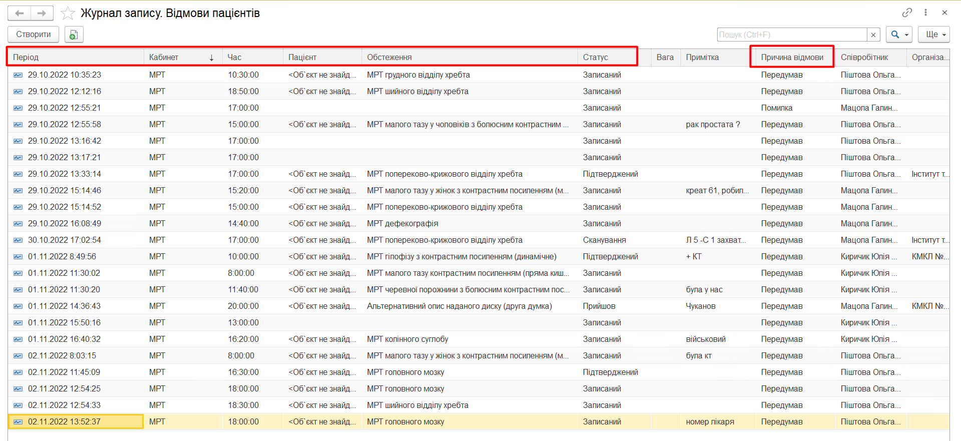 Журнал запису Відмови пацієнтів