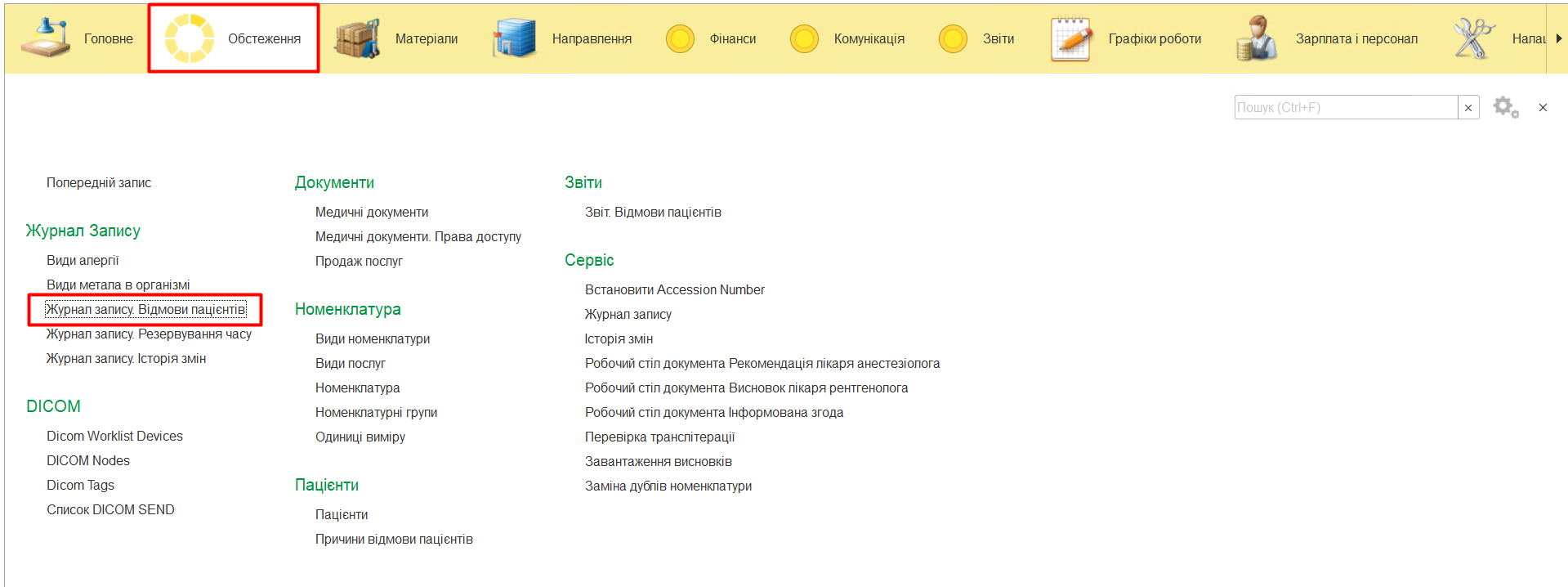 Для роботи з Журналом запису Відмови пацієнтів використовується довідник Відмови пацієнтів, який знаходить в меню «Обстеження» - «Журнал запису Відмови пацієнтів». Де можливо переглянути, коли, хто і по який причині відмовився від обстеження.