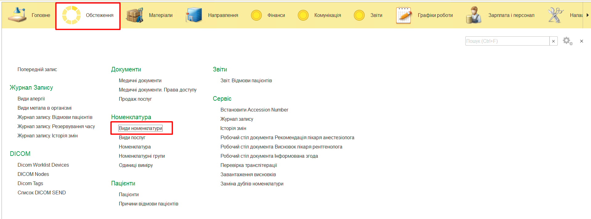 Довідник знаходиться в меню «Обстеження» - «Види номенклатури». В залежності від Виду номенклатури, послуга буде або не буде відображатись в Журналі запису - «Обстеження».