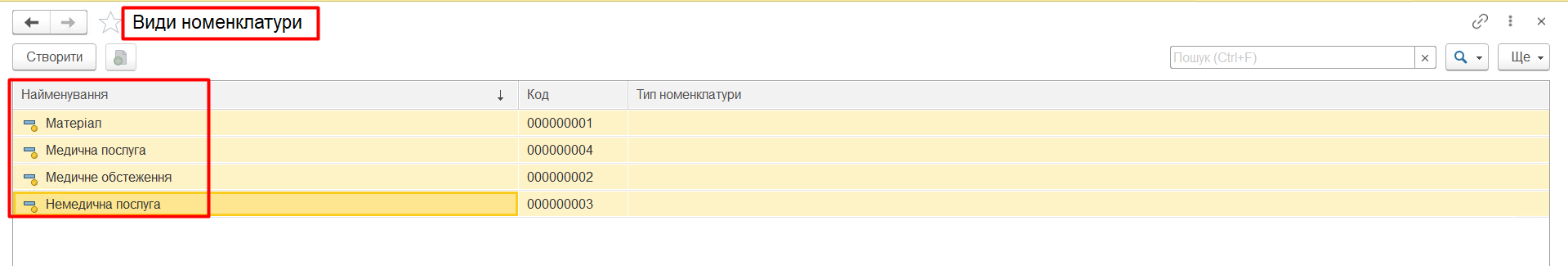 Якщо потрібно створити новий Вид номенклатури, натискаємо кнопку «Створити» і заповнюємо наступні поля: