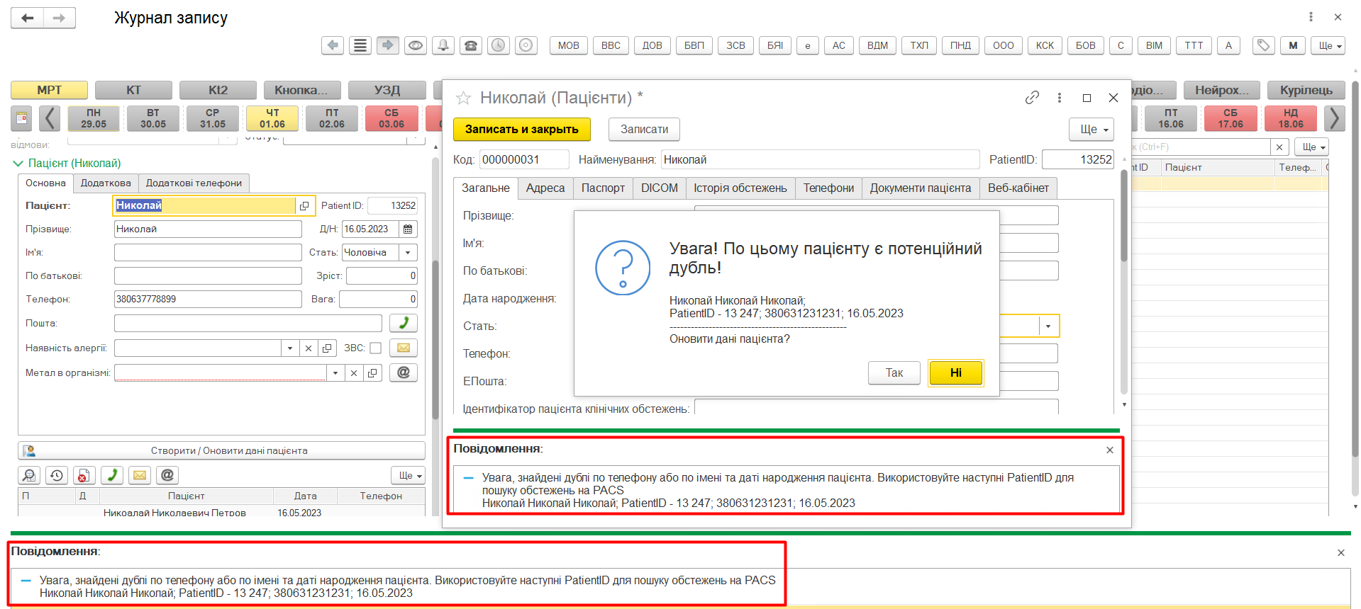 Якщо в МІС (в Журналі запису або в довіднику Пацієнти) з'являється наступне повідомлення, потрібно перевірити та виправити таких пацієнтів (PatientID) і їх обстеження (Accession Number) на PACS та в МІС і зробити однаковими.