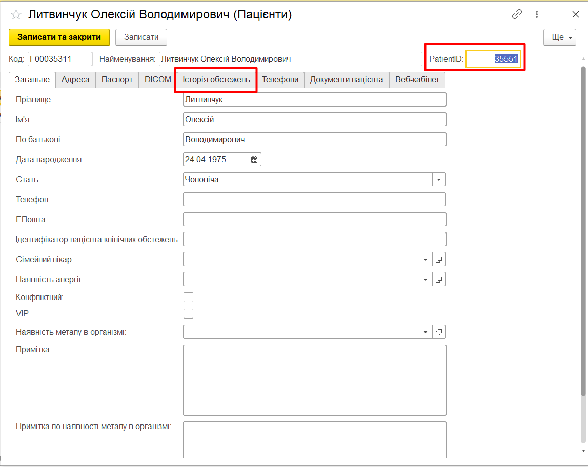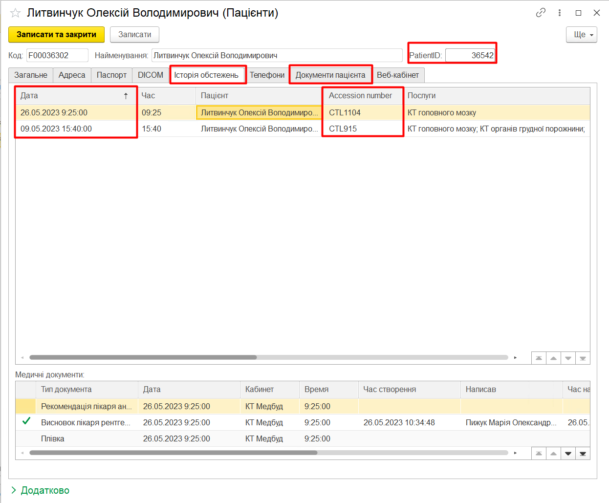 5. Переконуємося, що пацієнта змінено. Для цього відкриваємо картку пацієнта і переконуємося що в всі обстеження і документи пацієнта (дубль), з'явилися на вкладках “Історія обстежень” та “Документи пацієнта”.