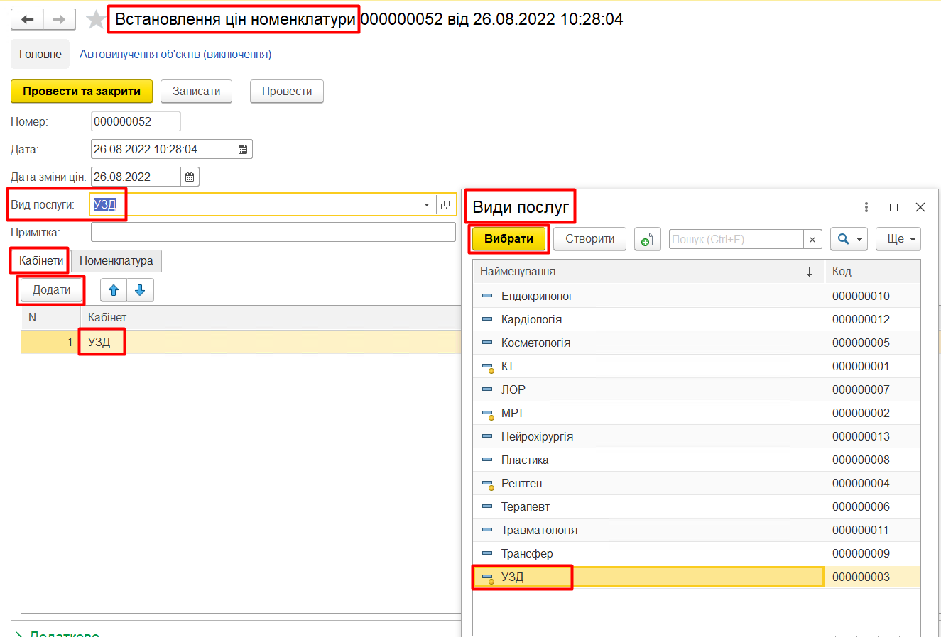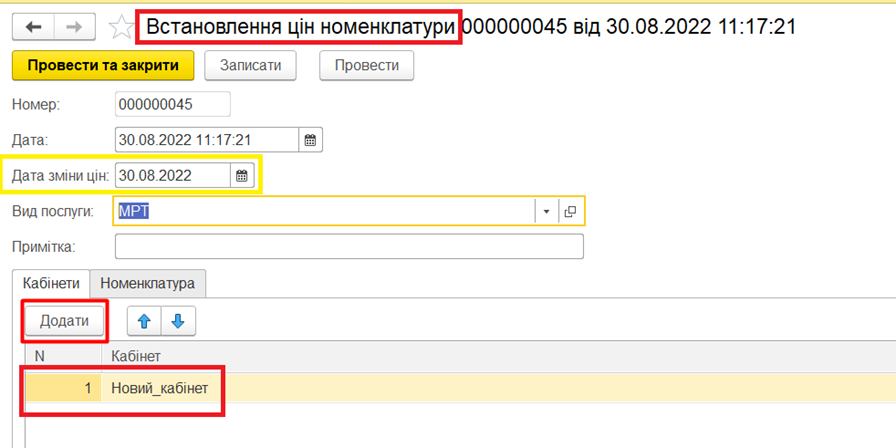 Після того, як буде додана вся необхідна номенклатура, необхідно додатково перевірити встановлений параметр «дата зміни цін» і натиснути кнопку «Провести та закрити».