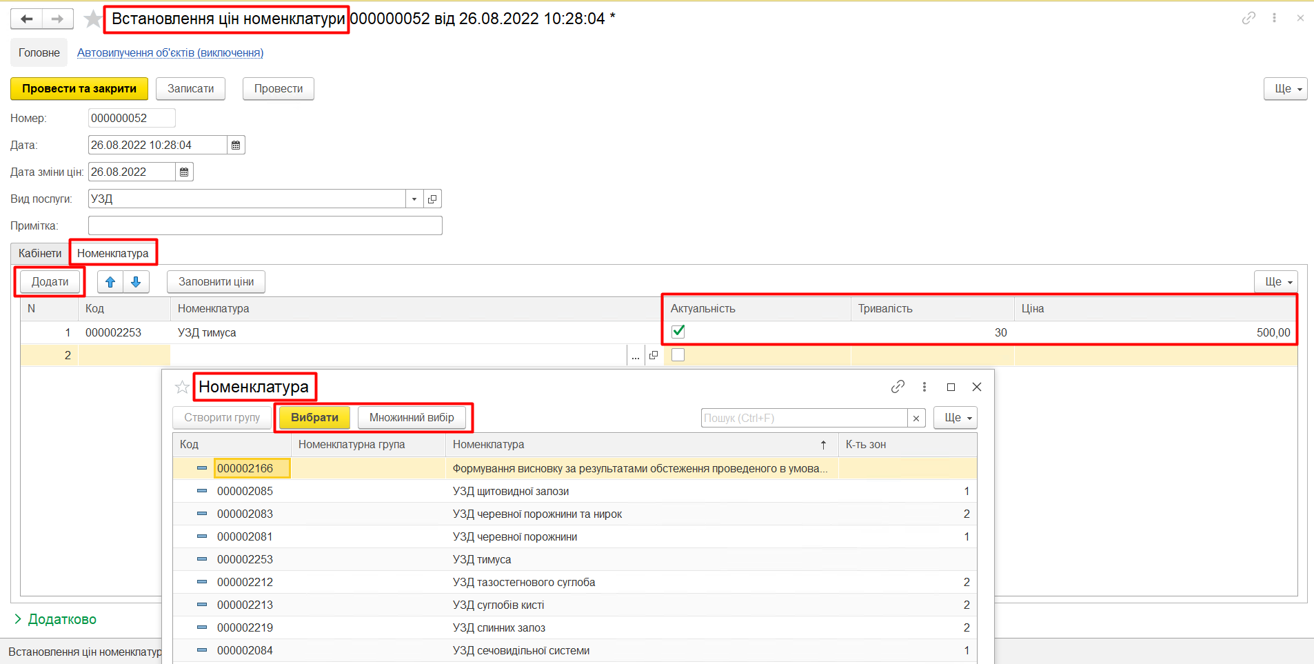 По кожному вибраному рядку необхідно встановити прапорець «Актуальність». Якщо прапорець активовано, номенклатура буде використовуватися, якщо зняти, вона буде невидима і її не можна буде використовувати. Такий прапорець необхідно знімати для тієї номенклатури, яка частково, або повністю не використовується. Далі, необхідно встановити тривалість, для тих обстежень які займають час, вона має бути від 5 хвилин і більше, з кратністю в 5 хвилин, тобто 5, 10, 15, 20… І на останок потрібно встановити вартість.