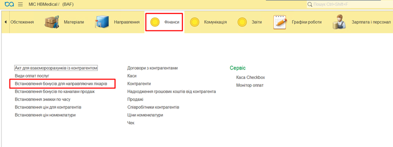 Для встановлення бонусів для направляючих лікарів необхідно зайти в меню «Фінанси» - «Встановлення бонусів для направляючих лікарів».