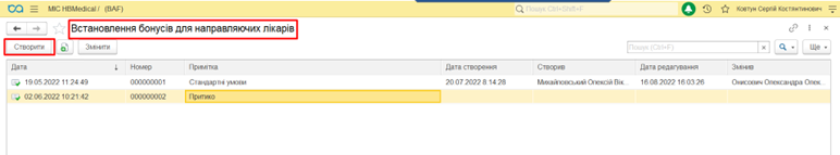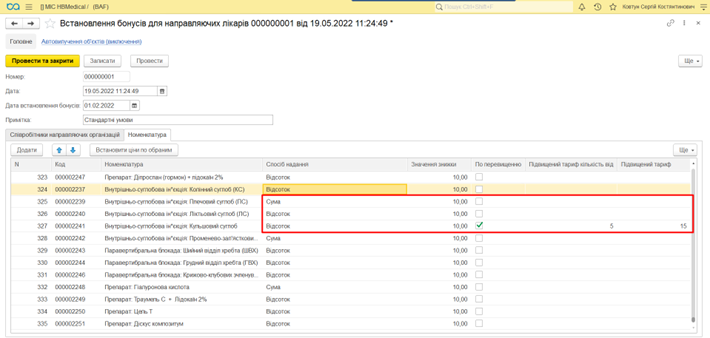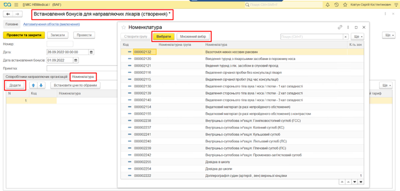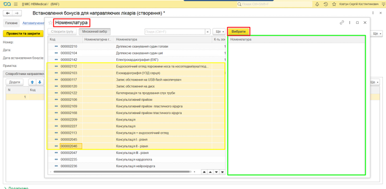 Нарахування бонусів по лікарю відбувається згідно вказаної в документі номенклатури.