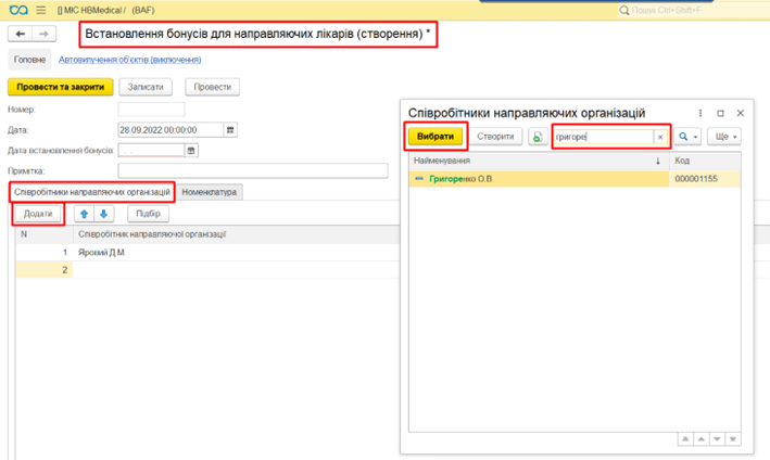 Якщо бонуси нараховуються по різним відсоткам/сумам для кожного направляючого лікаря, потрібно на вкладці «Співробітники направляючої організації» натиснути «Додати» та обрати співробітників направляючої організації.