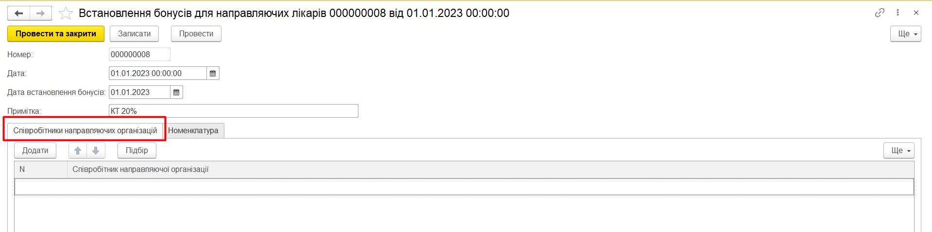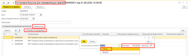 Якщо така номенклатура є в документі Встановлення бонусів для направляючих лікарів