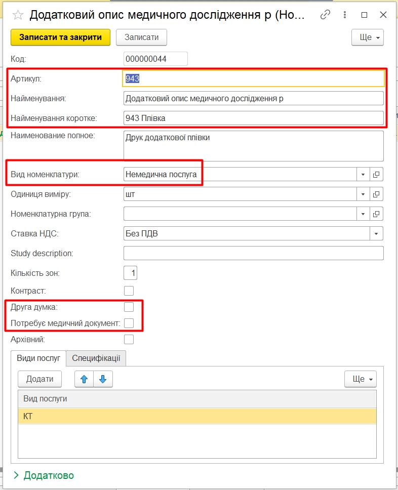 Також можливо додати всю Вид Номенклатури (Немедична послуга або Медична послуга) для автоматичного встановлення ДЗБ в документах Продаж