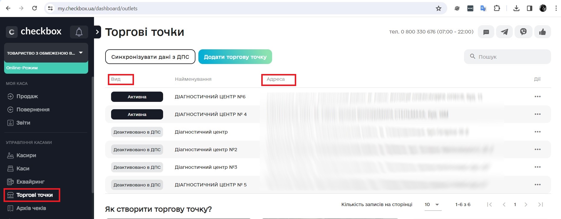 Ваша «Торгова точка», за вказаною адресою, де будуть оплачуватися надані послуги / обстеження, повинна бути - Активна.