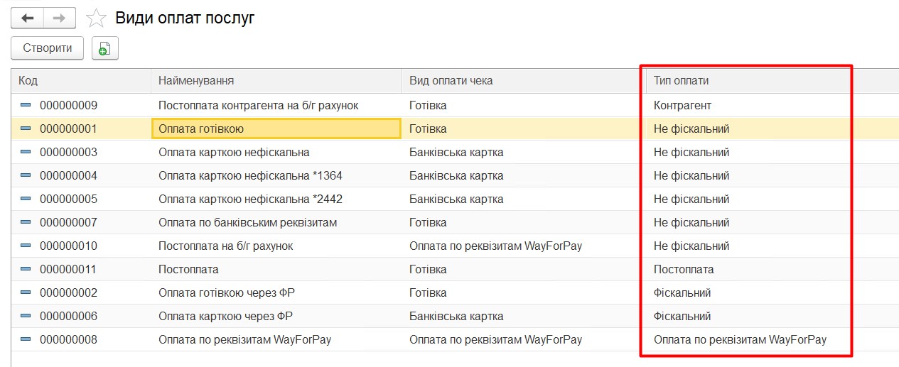 Для налаштування каси потрібен «Фіскальний» тип оплати з видом оплати - Готівка та Банківська картка, який створює документ «Чек».