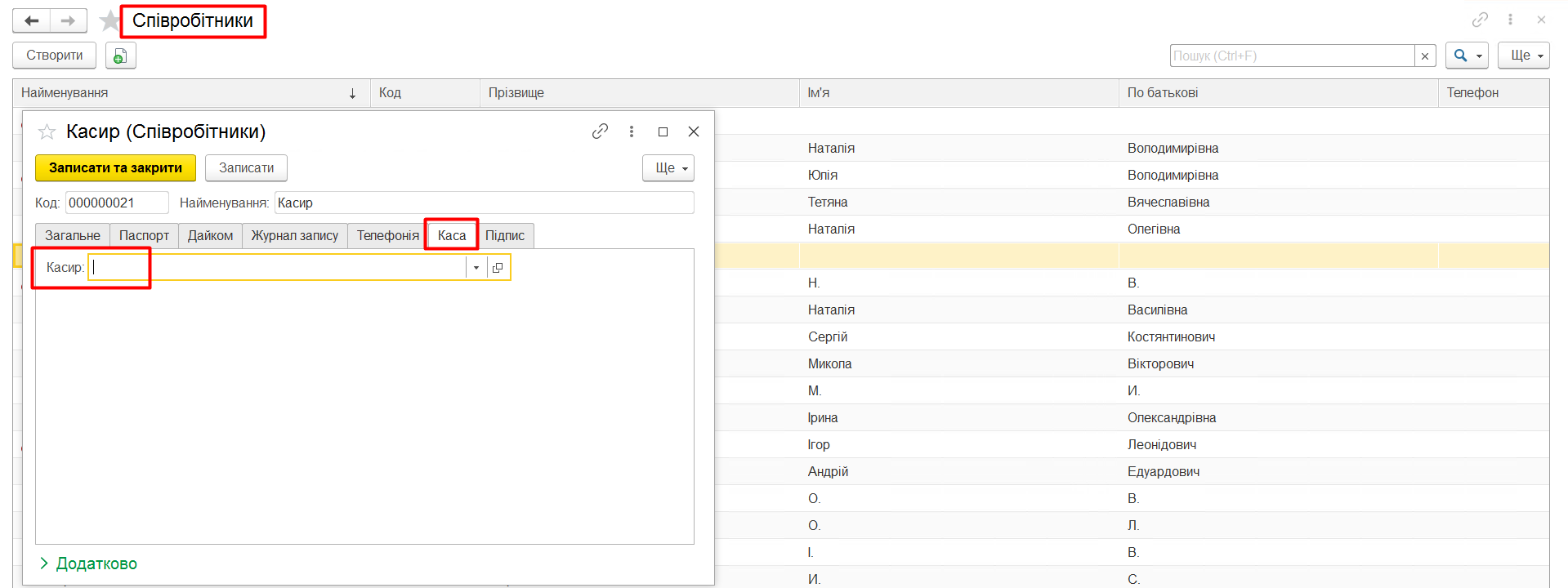У розділі Співробітники на вкладці Каса - обираємо потрібного касира.