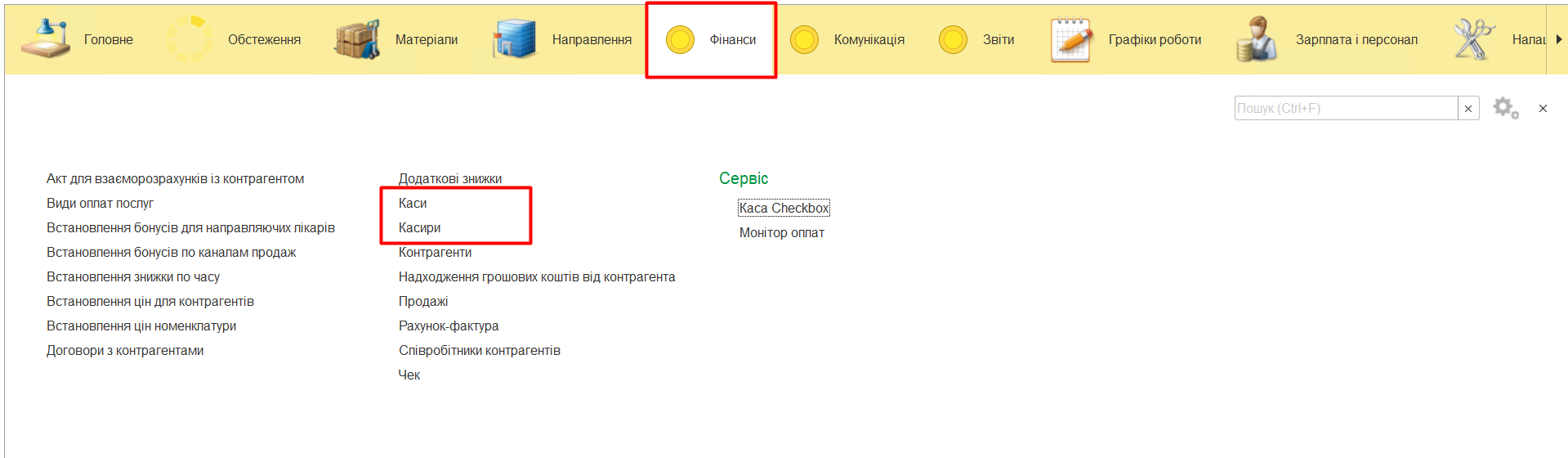 Логін та пароль касира, які були отримані з особистого кабінету на сайті https://my.checkbox.ua повин бути доданий в налаштування МІС, в розділ Фінанси - касири.