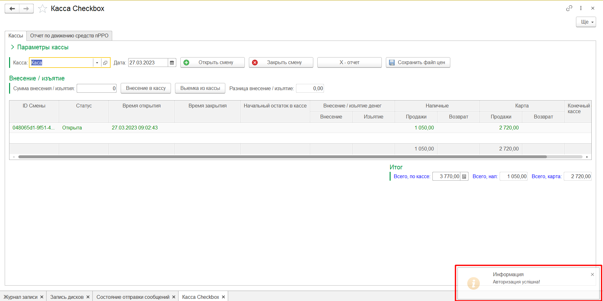Якщо налаштування касирів введені коректно в чекбоксі, виникне наступне повідемлення - Авторизація успішна!