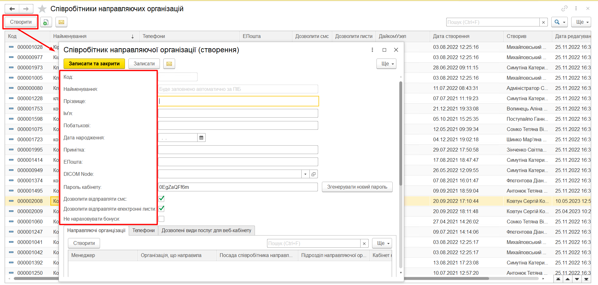 Для створення співробітника необхідно в розділі головного меню «Направлення» - «Співробітники направляючих організацій» натиснути кнопку «Створити» та почергово заповнити реквізити: