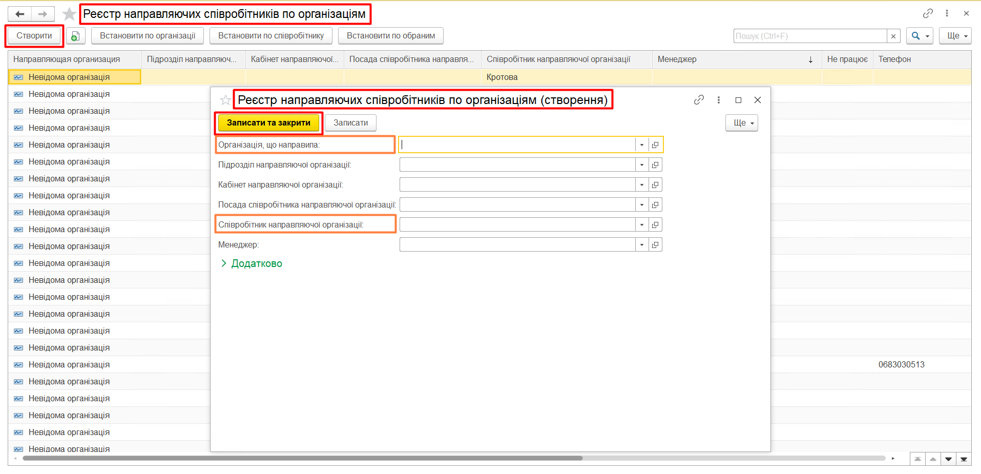 Для того щоб прив’язати менеджера до організації або до співробітника необхідно за допомогою кнопки «Створити», викликати форму, в якій у якості об’єкта вказати направляючу організацію. Або співробітника, а потім вказати менеджера, після чого натиснути кнопку «Записати та закрити»..