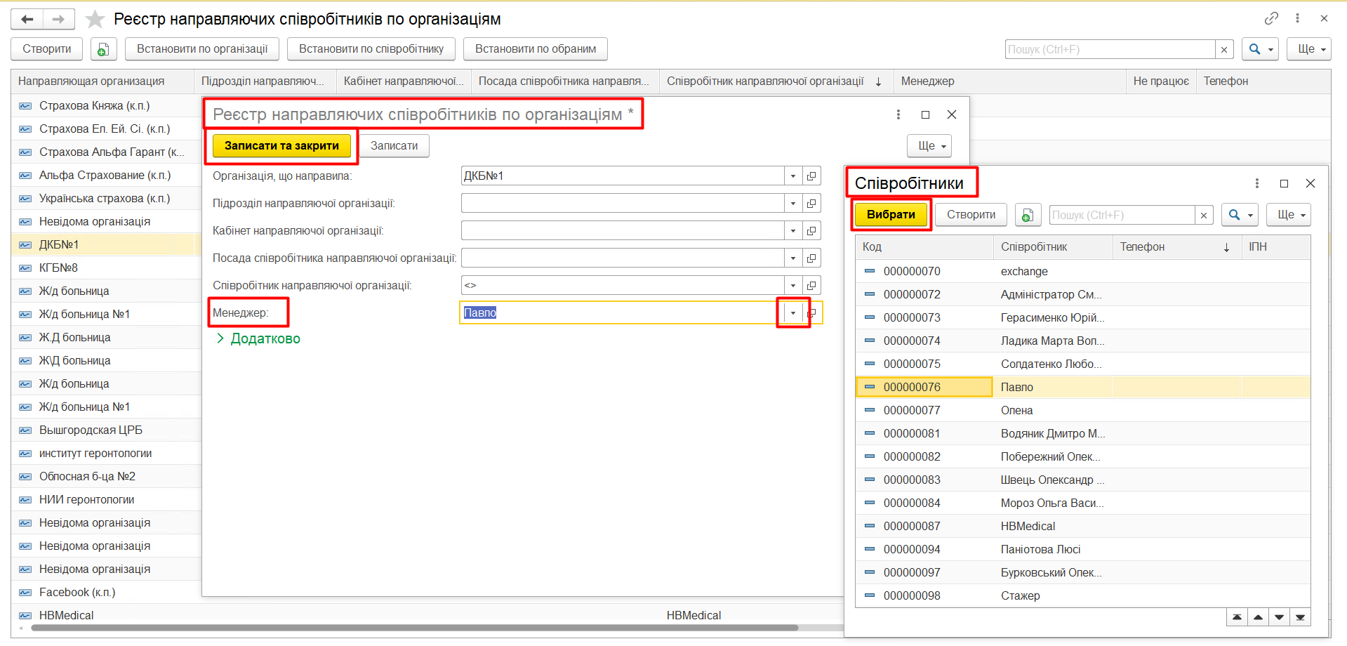 За допомогою реєстру «Менеджери закріплені за направляючими організаціями» є можливість вести облік закріплених менеджерів або за організацією або за лікарем.