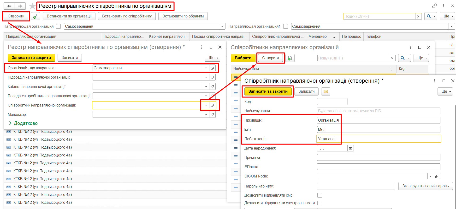 У випадку, якщо пацієнт звертається без направлення, є можливість створити організацію з назвою діагностичного центру та створити співробітника з найменуванням «самозвернення».