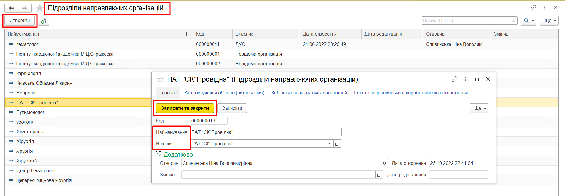 Для створення нового Підрозділу направляючої організації необхідно натиснути кнопку «Створити» та заповнити реквізити довідника у новому вікні, після чого натиснути кнопку «Записати та закрити».
