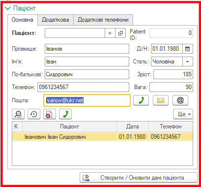 Кнопка «Створити / Оновити дані пацієнта» використовується лише тоді коли змінюються саме вищенаведені дані пацієнта розміщені на вкладках: «Основна», «Додаткова» і «Додаткові телефони, починаючи з прізвища і закінчуючи додатковими телефонами.