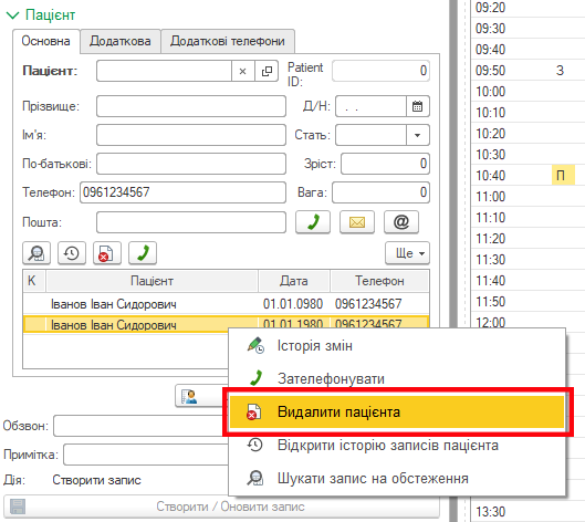 Для видалення пацієнта потрібно натисути праву кнопку мишки на рядку з пацієнтом в полі пошуку і вибрати «Видалити пацієнта»