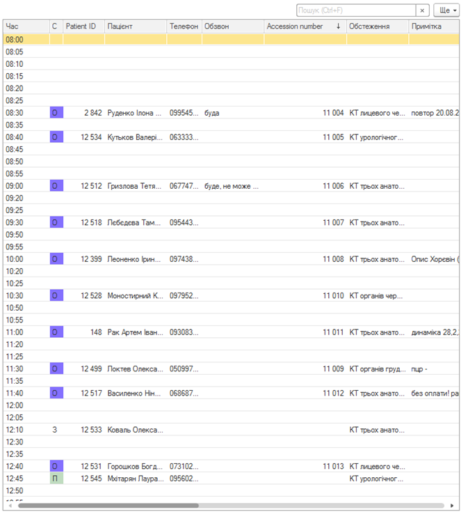 Нижченаведений список відображає всіх наявних пацієнтів в системі. Наявний прапорець в колонці «К» (клієнт) означає, що пацієнт хоч раз отримав послугу в діагностичному центрі (є проведений документ «Продаж послуг» зі статусом «Обстежений»).