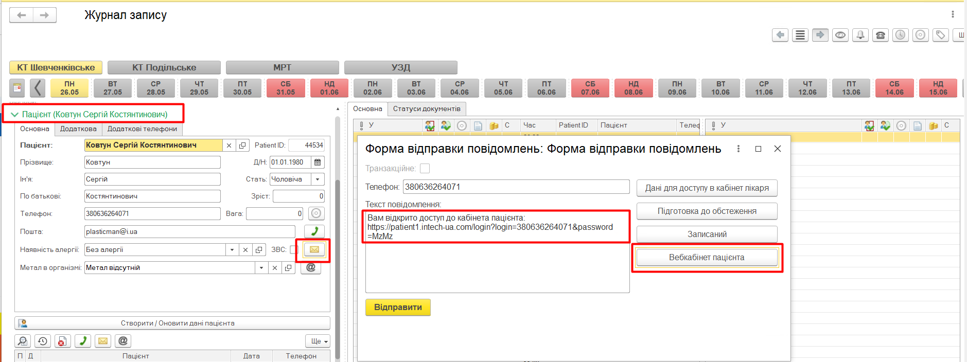 Відправити пацієнту смс. |