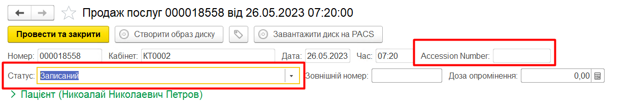 Увага! Якщо запис, перенесться до іншого кабінету з однаковими послугами (номенклатурою) був у статусі “Сканування” (або “Обстежений”) і мав Accession Number, то при переносі статус документу оновиться на “Записаний”, а Accession Number буде пустий і його потрібно буде згенерувати заново, коли документ змінить статус “Сканування”.
