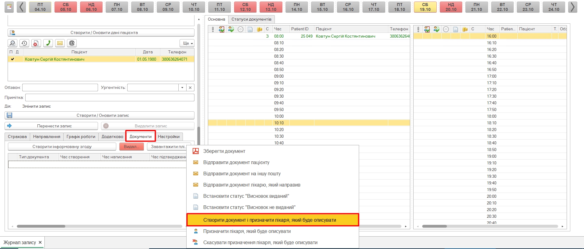 Для цього необхідно вибрати відповідний запис в Журналі запису, перейти на вкладку "Документи", правою кнопкою миші викликати додаткове меню. Вибрати пункт - “Створити документ і призначити лікаря, який буде описувати”