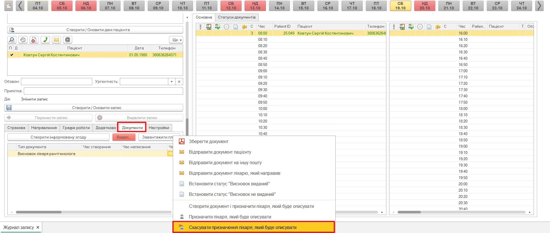 Також у Журналі запису є можливість призначити лікаря, який описуватиме даного пацієнта (обстеження), наприклад, "Зовнішнього лікаря".