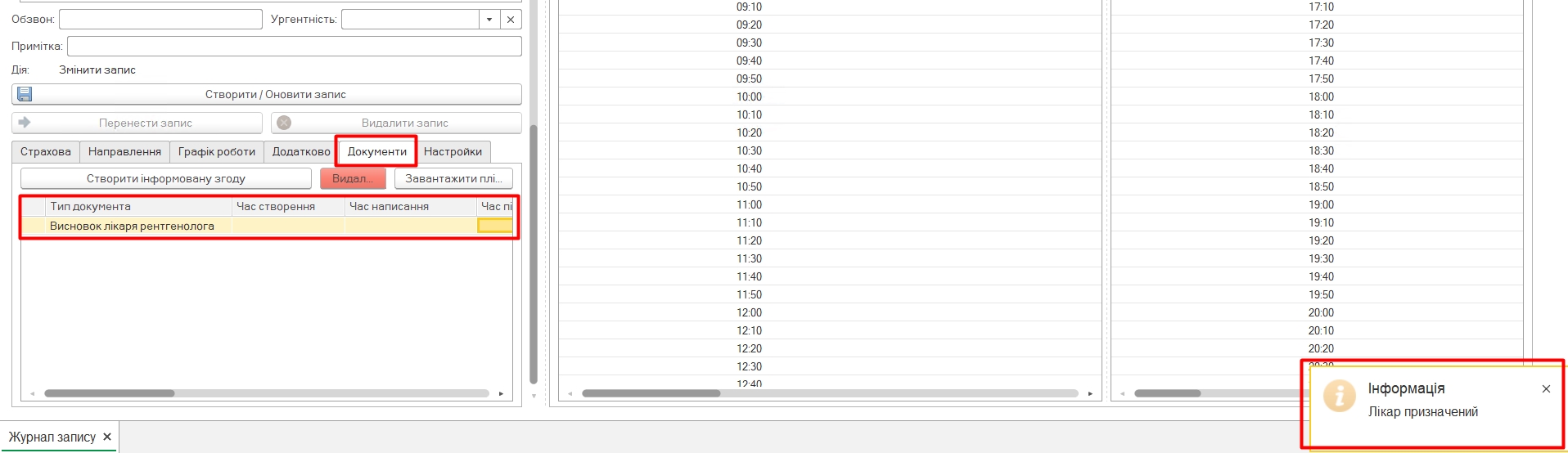 Після чого, в нижньому кутку Журналу запису з'явиться відповідне повідомлення про призначення лікаря та прикріпиться зазначений шаблон.