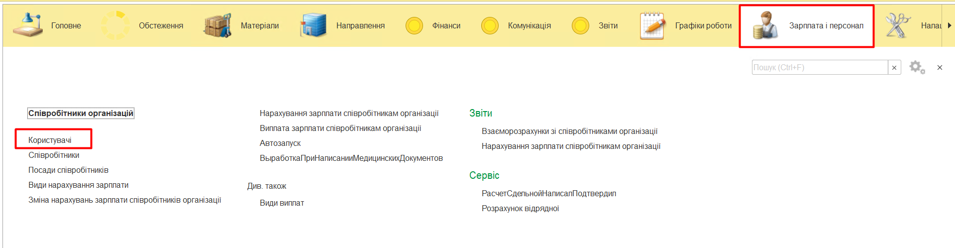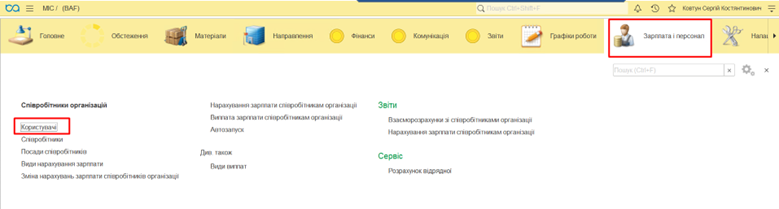 Після того, як відкриється вікно програми у верхній шапці вибрати пункт меню «Зарплата і персонал» - «Користувачі»