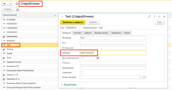 Після автоматичного створення співробітника, потрібно зайти в довідник «Співробітники», вибрати нового співробітника і в його картці додати номер його мобільного телефону (у форматі “80ХХХХХХХХХ”), який у подальшому буде використаний як Login на WEB-сторінці (особистого кабінету).