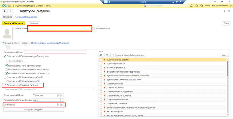За замовчанням МІС автоматично створює співробітника разом з користувачем з такою ж самою назвою. Після того, як ввели «Назву» потрібно обрати будь-яке інше поле форми, або клікнути на вільне місце.