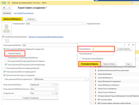 Після того як користувач був створений, йому потрібно встановити пароль. Для цього наш користувач повинен бути виділений і натискаємо кнопку «ЗмінитиПароль». Після цього з’явиться нове вікно, в якому потрібно ввести пароль і його підтвердження – призначення рядка очевидно, вам потрібно придумати кодовий набір символів, а після повторно ввести для підтвердження.