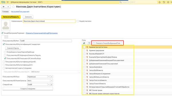 Якщо користувачу потрібно додати роль, то потрібно відпустити кнопку «ПоказатиТількиВибраніРолі». Після цього повинні з’явитися всі ролі, наявні в системі.