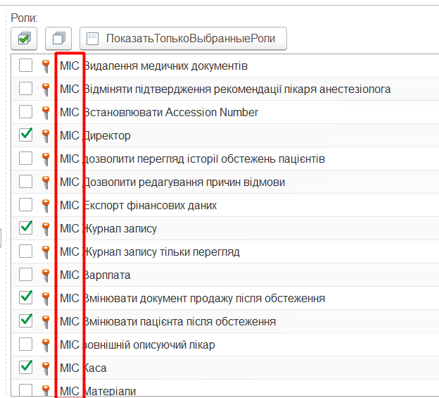 Крім обов'язкових ролей в залежності від того, яку посаду працівник медичного закладу займає, ми надаємо різні роли (які починаються з префікса «МІС»).
